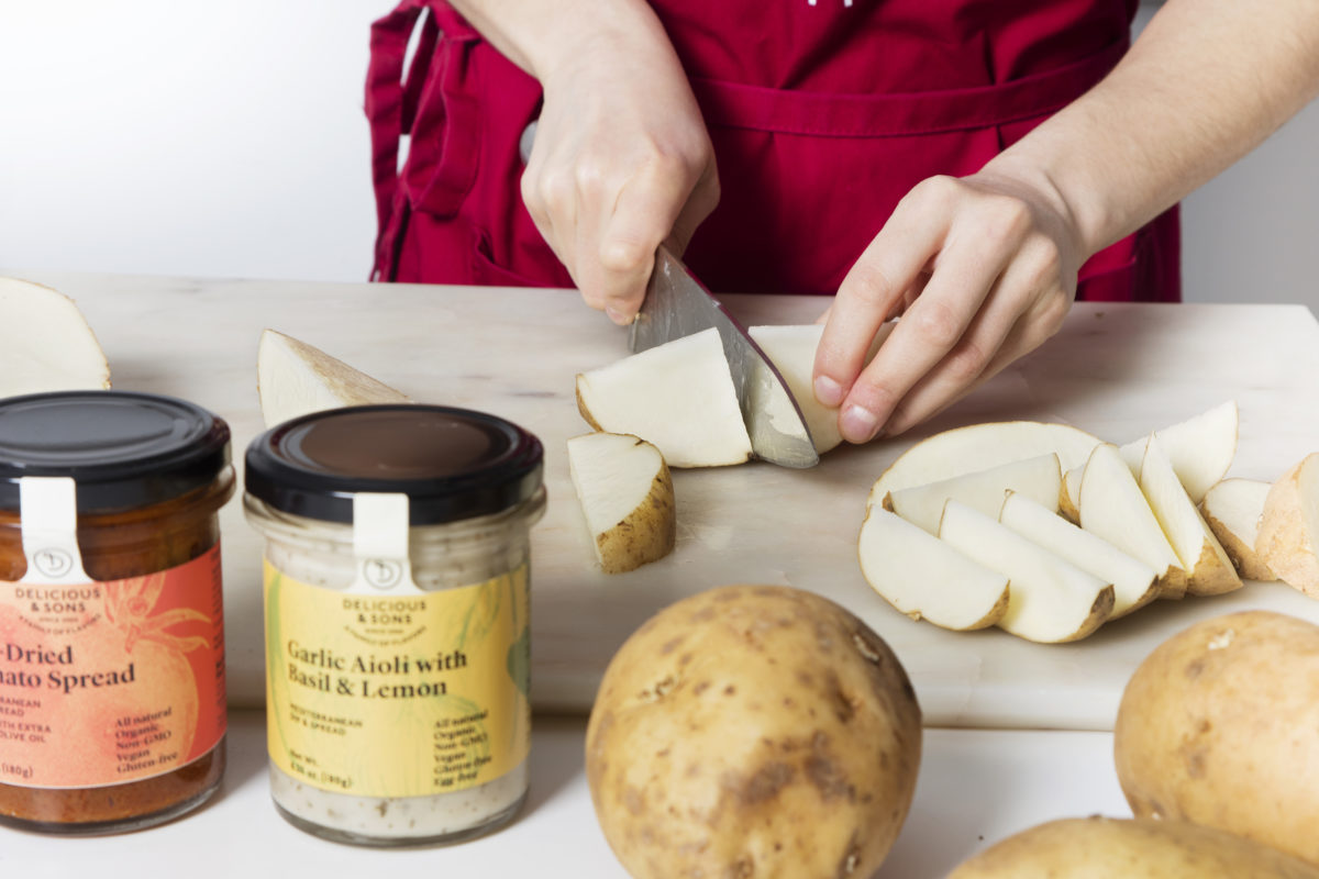 6. Servir acompañadas del Alioli con Albahaca y Limón y el Paté de Tomates Secos.