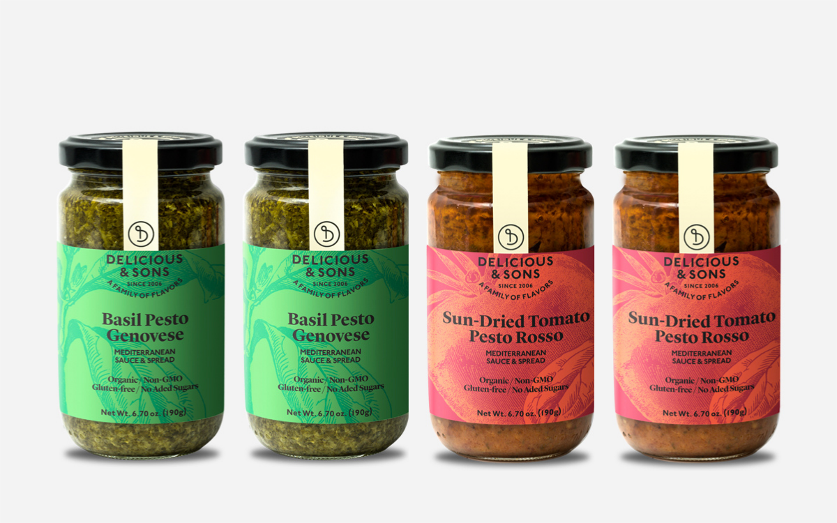 Sun-Dried Pesto Rosso: Organic sun-dried tomatoes, organic sunflower oil, organic tomato pulp, organic basil, organic apple vinegar, Parmiggiano Reggiano cheese PDO (cow’s milk, salt, rennet), organic potato starch, salt, acidity regulator: lactic acid, antioxidant: ascorbic acid.